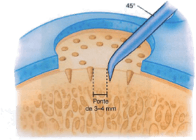 2.microfratura associada a membrana para cobertura – realização de pequenos orifícios (microfratura) associada à cobertura da área da lesão com uma membrana para conter e direcionar a formação do novo tecido (cicatrização)